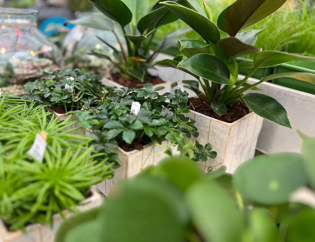 Door de ruime keuze aan mooie schalen van glas, keramiek, kunststof maar ook manden maken wij plantenstukjes voor ieders keus. U kunt gezellig langskomen om planten uit te zoeken, zodat wij een mooi arrangement kunnen samenstellen.