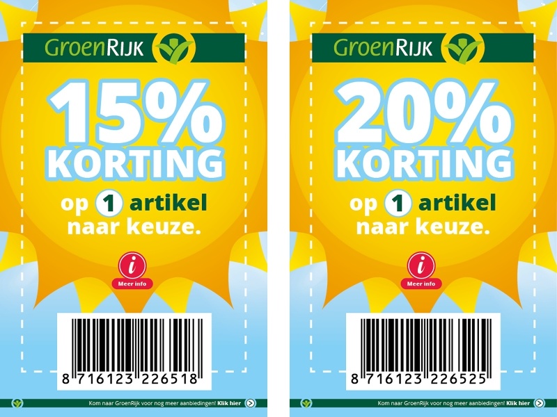 - De 15% en 20% keuzekortingsbonnen zijn geldig van 20 t/m 26 juli 2022 bij alle GroenRijk tuincentra (niet in de webwinkels).