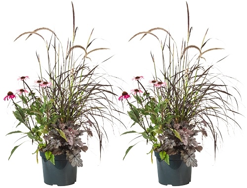 Op een speelse manier combineert de elegante Triple Beauty drie vaste planten en grassen in één pot.